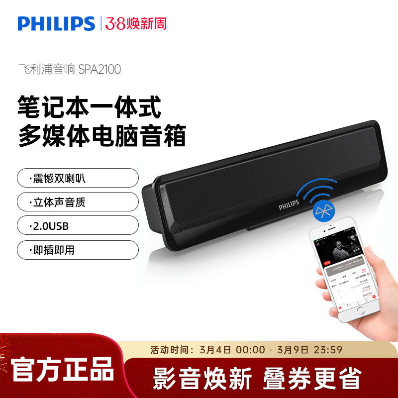 飞利浦SPA2100笔记本电脑小音箱便携可夹USB双模台式有线蓝牙音响