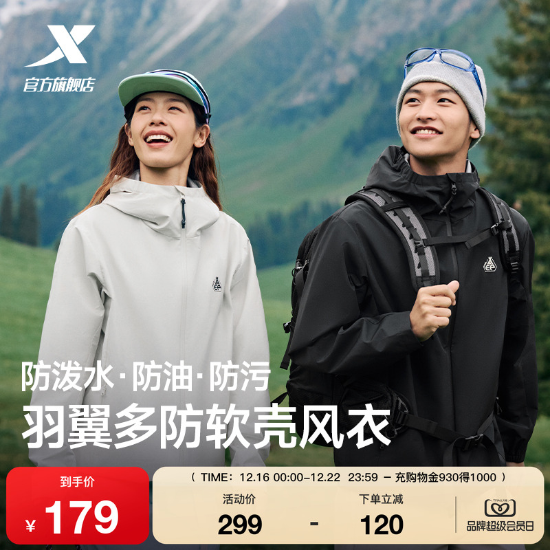 特步羽翼软壳衣男女款户外防泼水外套情侣登山服防风连帽冲锋风衣
