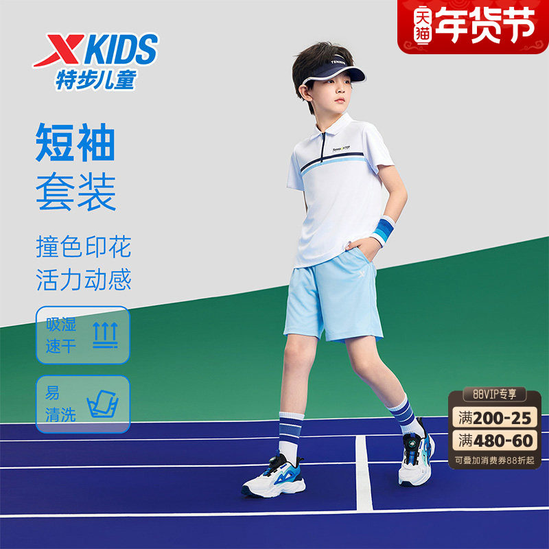 特步童装夏季男童运动针织网球套装儿童运动短袖短裤中大童两件套