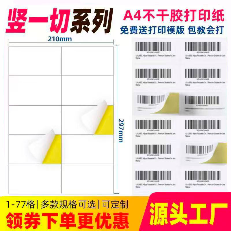 A4不干胶打印纸竖1刀分切空白内切割亚光面标签贴纸4/6/8/10/12 14 16 18 20 22格标签打印纸条码纸胶标签贴