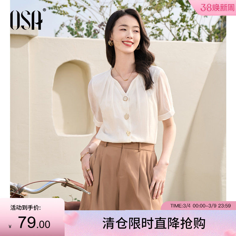 OSA欧莎职业OL短袖雪纺衬衫上衣女2025年夏季新款通勤气质V领衬衣