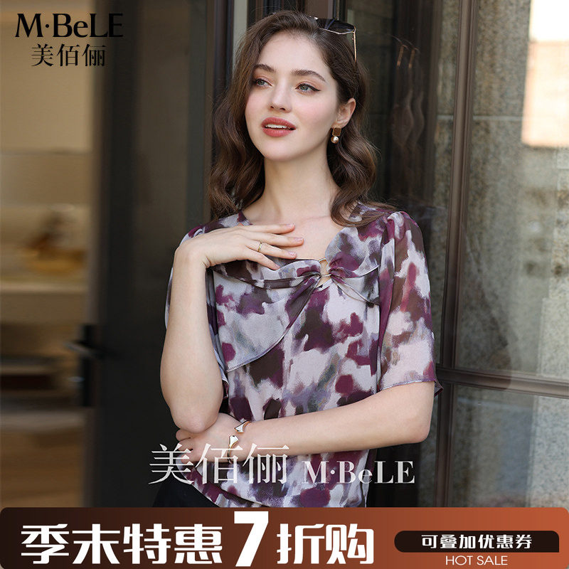 美佰俪雅致印花雪纺衫女2025夏季新款法式设计感短袖气质减龄上衣