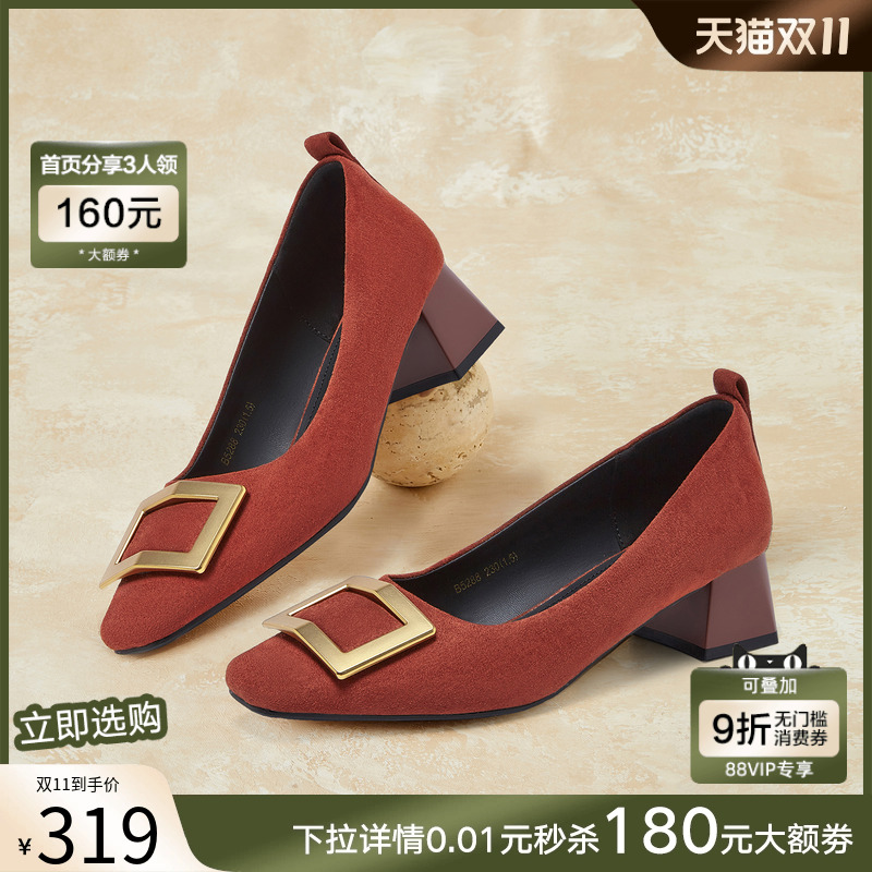 百思图2025秋新款方扣绒面粗跟一脚蹬女浅口单鞋红色婚鞋B5288AQ6