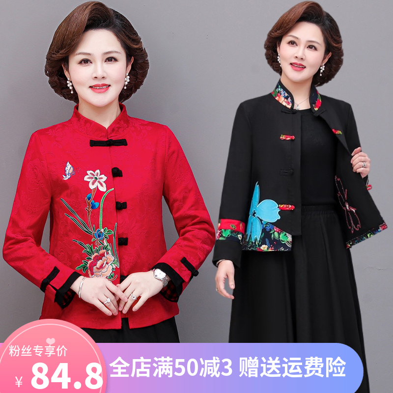 民族风妈妈装春秋短款外套中国风绣花长袖开衫复古唐装立领上衣女