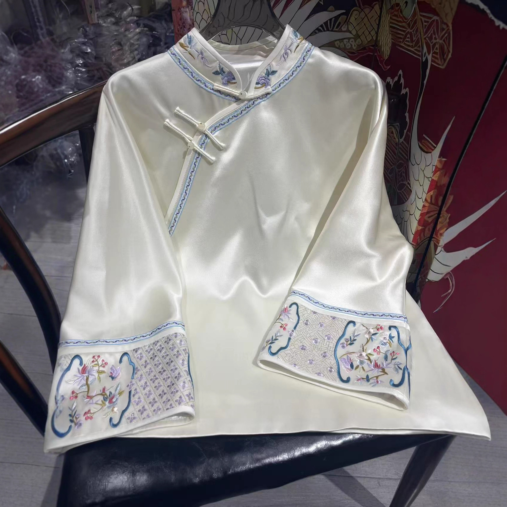 新中式醋酸刺绣长袖旗袍上衣女春秋宽松国风唐装衬衫民族风短外套