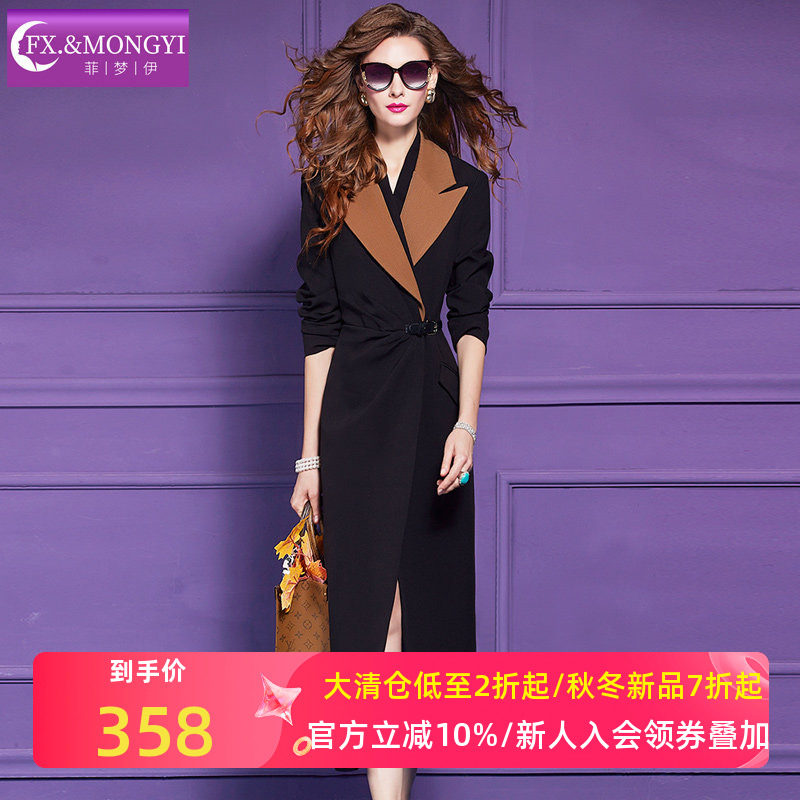 菲梦伊西装领风衣外套女秋季撞色拼接时髦收腰气质中长款流行大衣