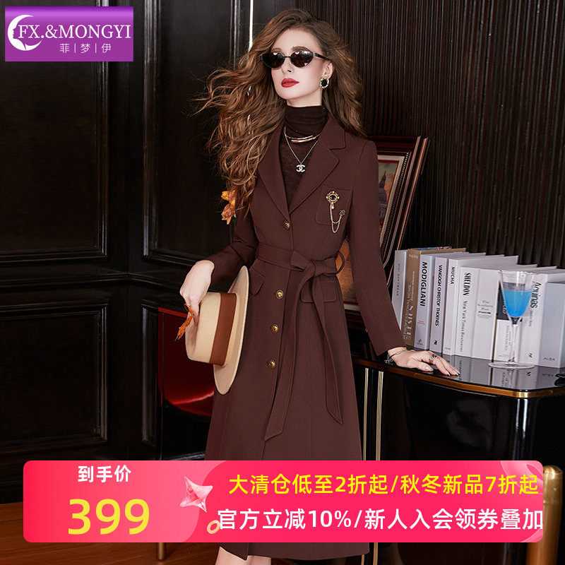 菲梦伊西装领风衣外套女秋冬季时尚休闲收腰双排扣中长款流行大衣