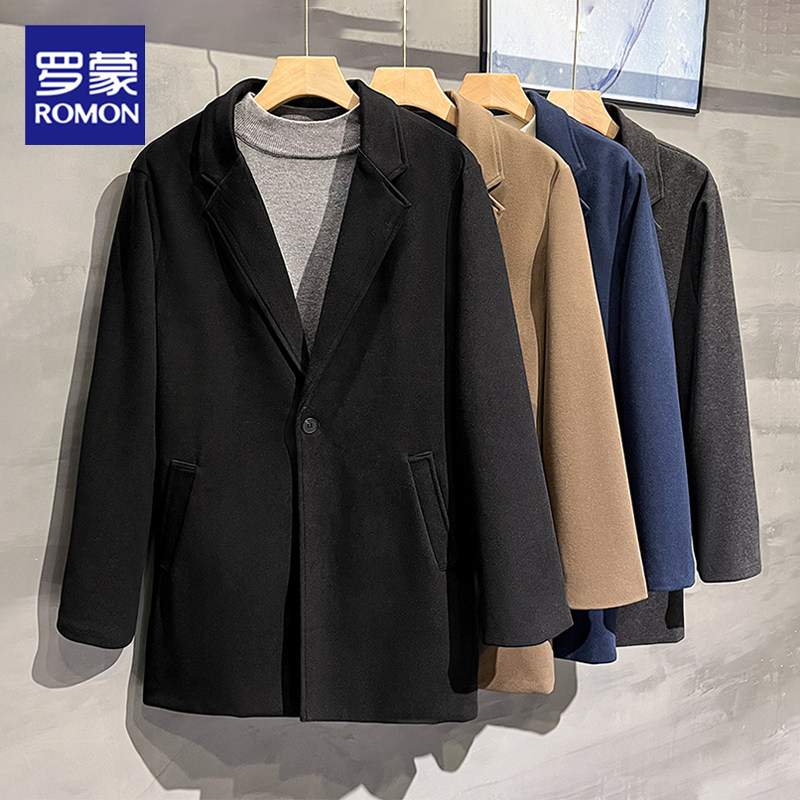 罗蒙毛呢大衣男款秋冬韩版时尚西装领风衣宽松帅气中长款呢子外套