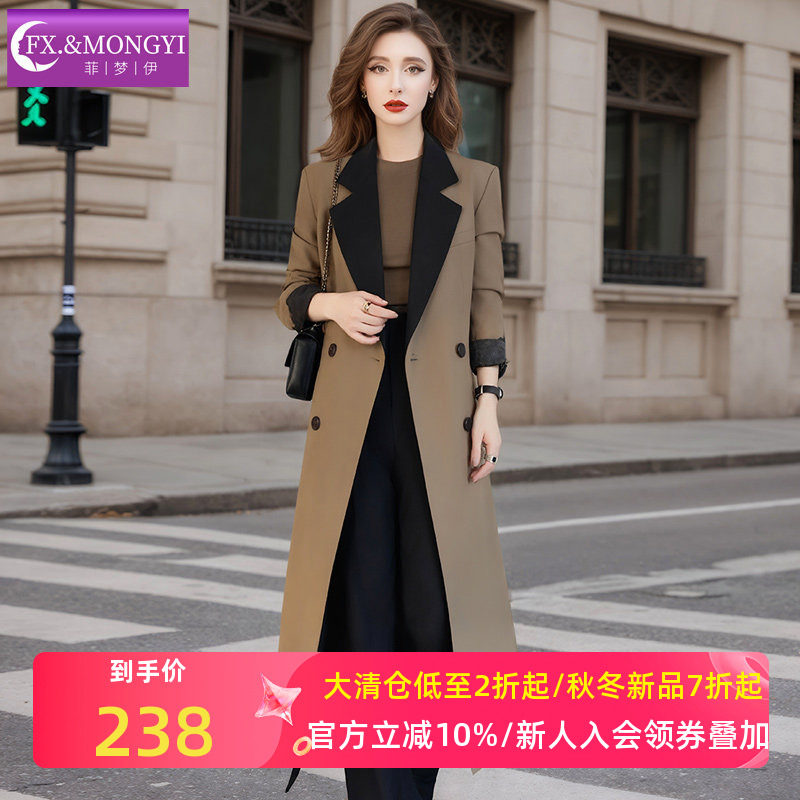 菲梦伊西装领风衣外套女秋季英伦风时尚休闲双排扣中长款流行大衣