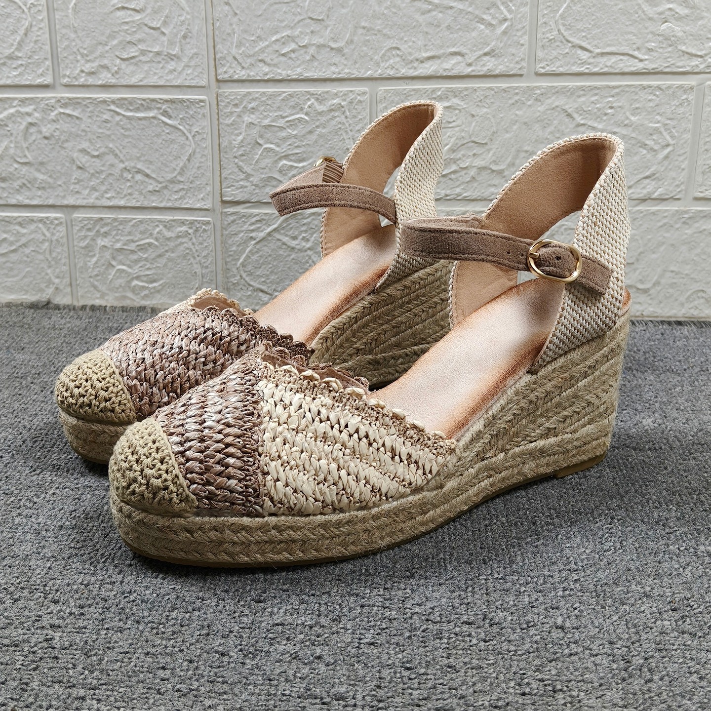 外贸中空麻绳编织坡跟凉鞋女2026夏季一字扣带厚底包头草编高跟鞋