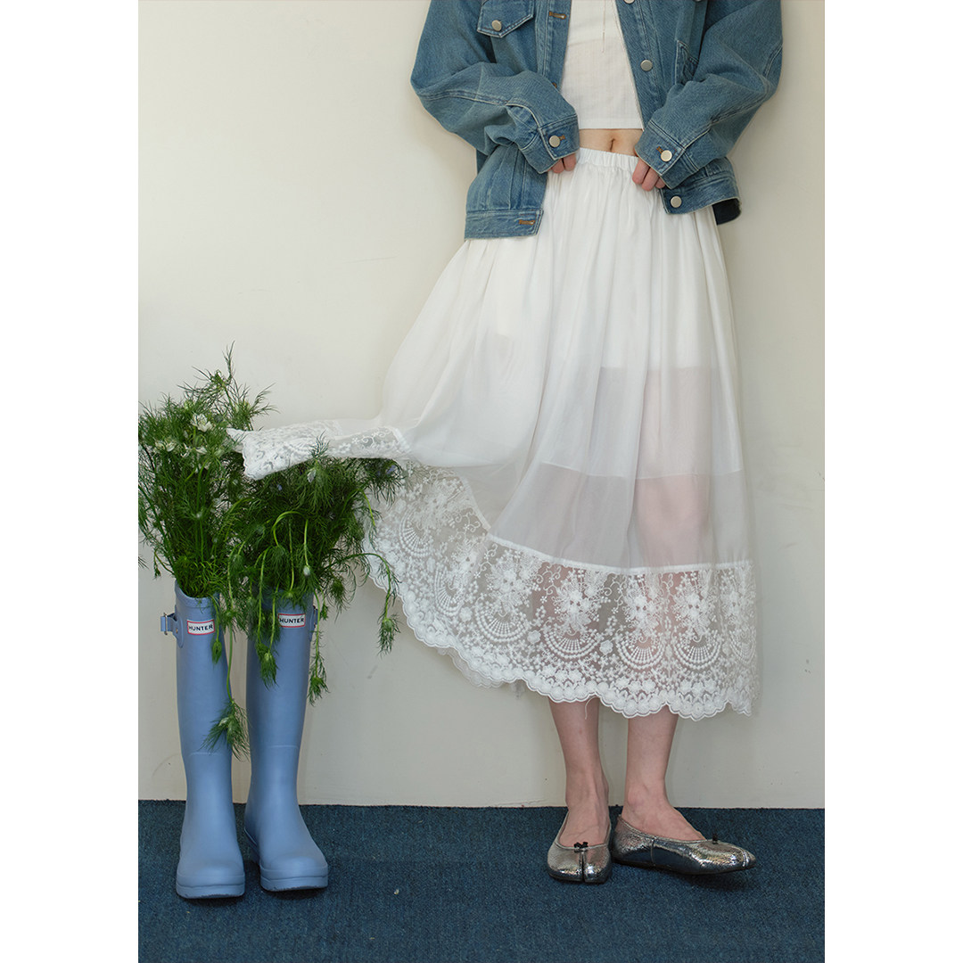BLUEerror 欧根纱蕾丝拼接长款半身裙女网纱刺绣白色大摆裙子早秋