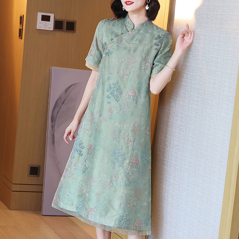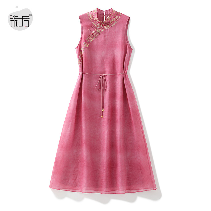 商场同款!新中式真丝欧根纱连衣裙女立领盘扣重工刺绣A字长裙夏