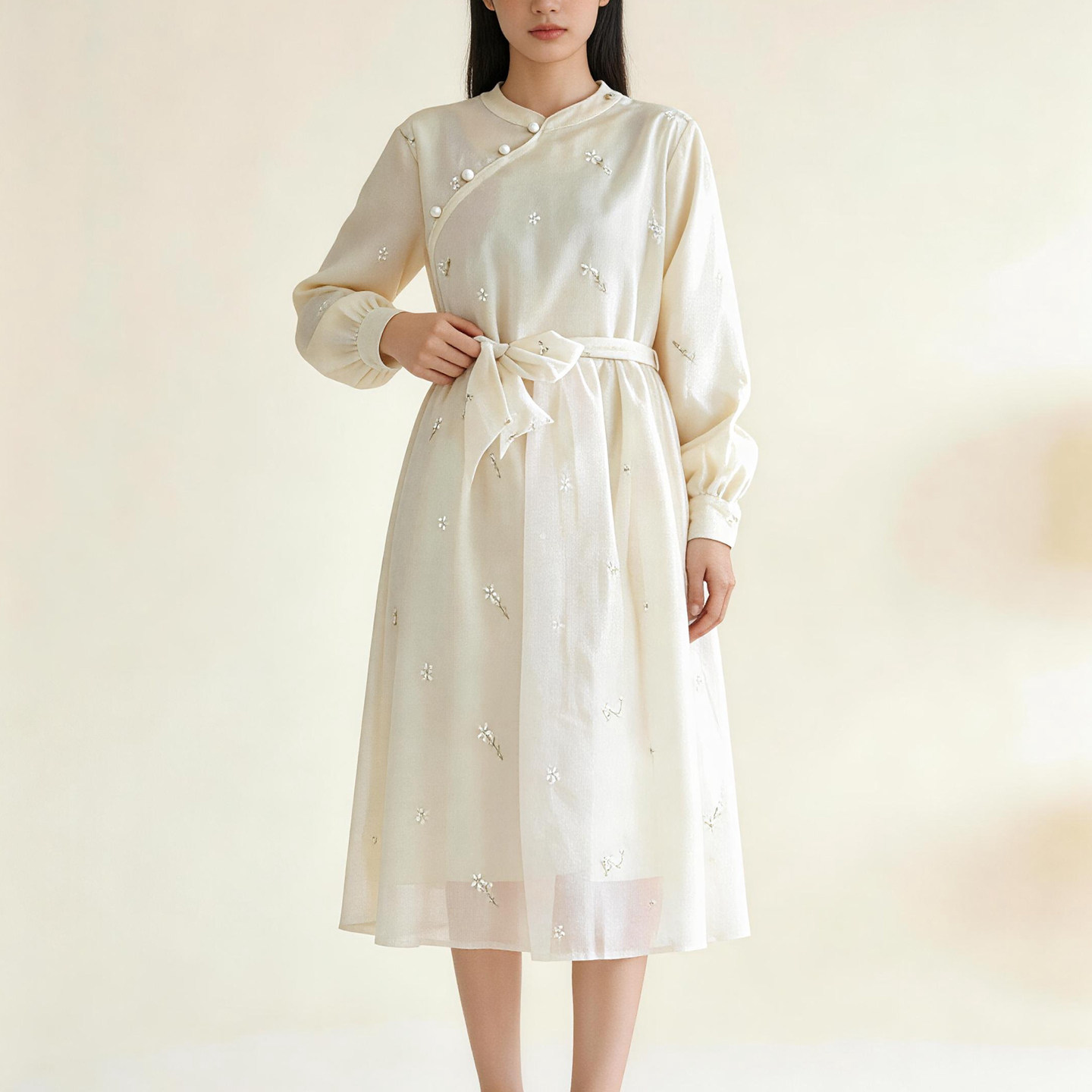 2026秋季新款欧根纱重工刺绣旗袍连衣裙收腰显瘦中长裙女中式国风
