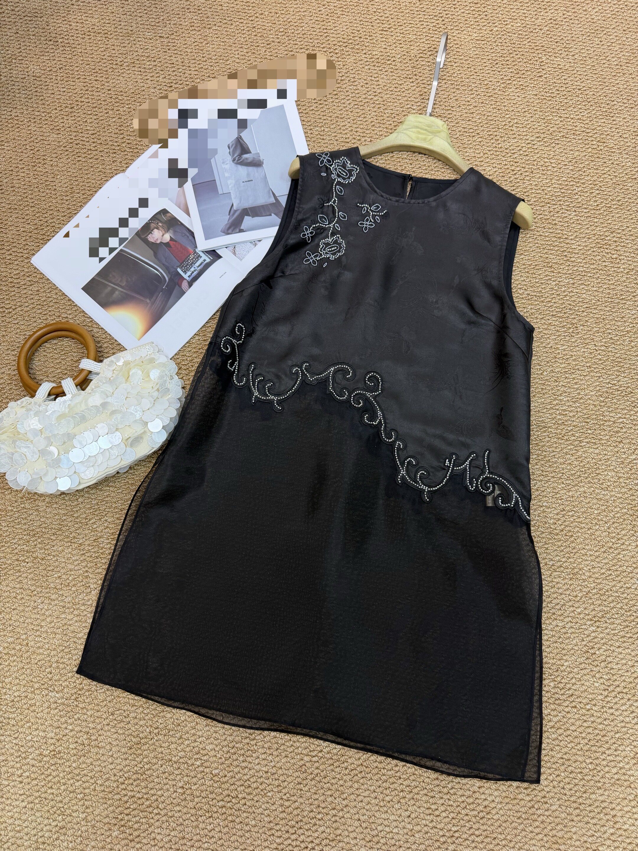 真丝香云纱重工刺绣拼真丝欧根纱无袖背心裙连衣裙新中式连衣裙女