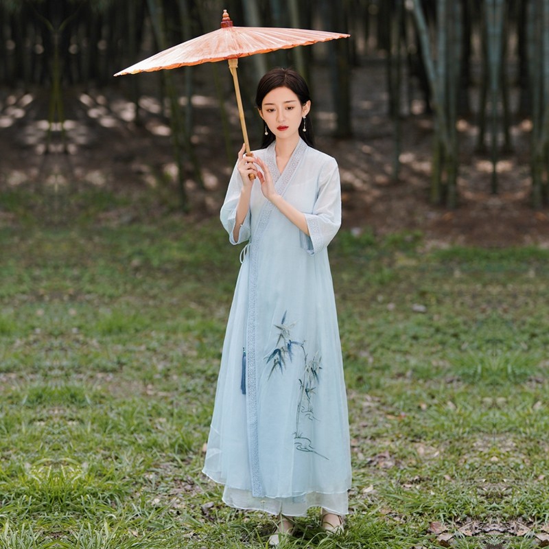 新中式改良汉服交领绑带中长长袍女高端欧根纱刺绣复古连衣裙女夏