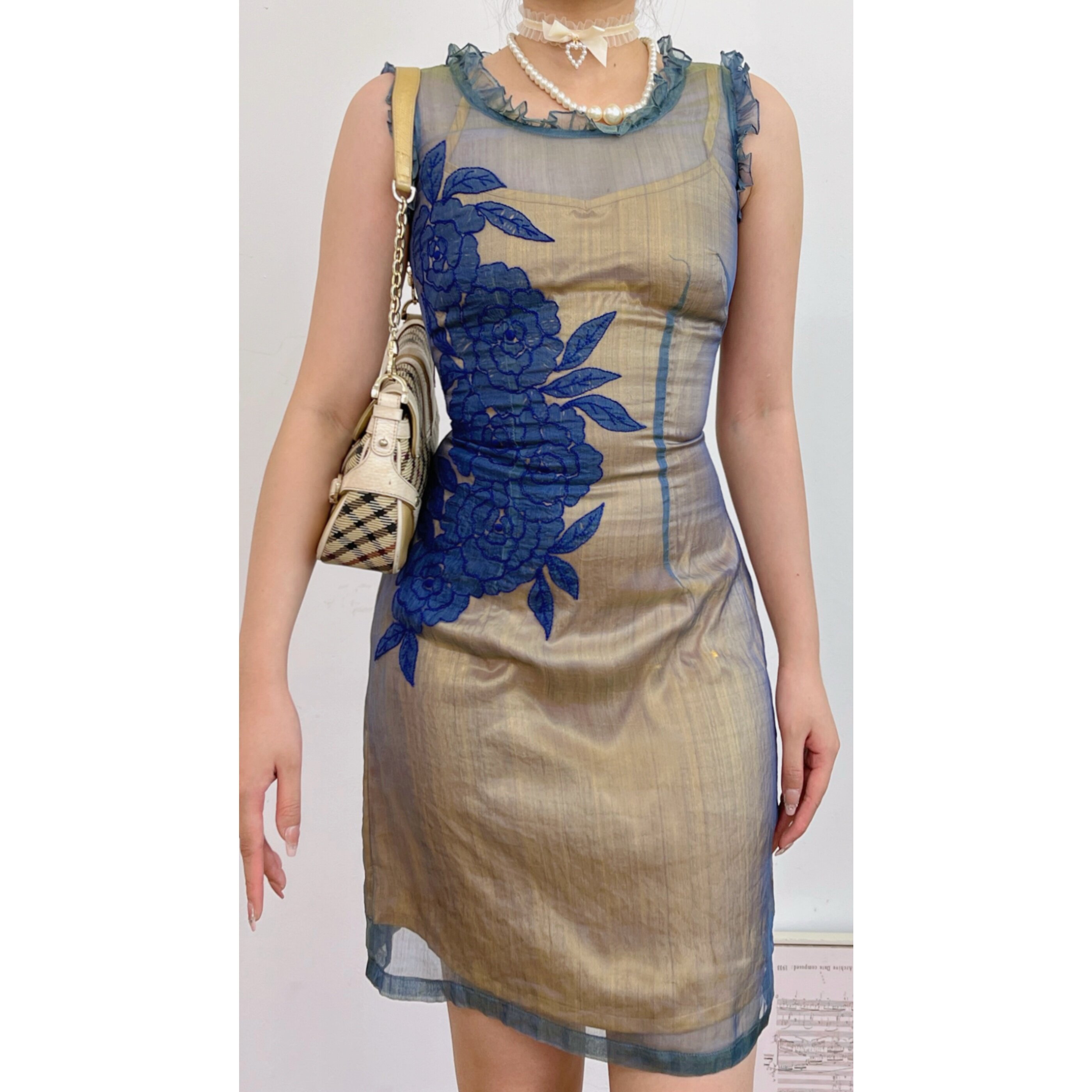 vintage古着轻熟优雅蓝色欧根纱花卉刺绣半透面料木耳边连衣裙女