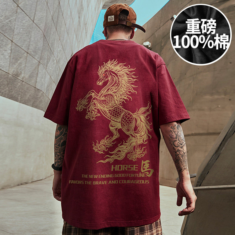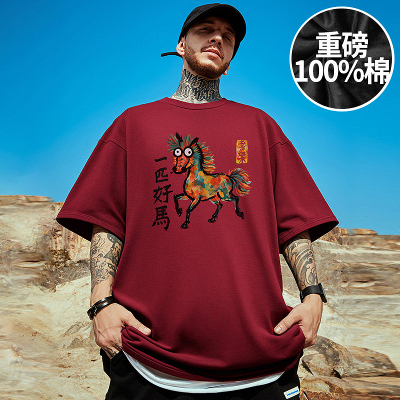 2026年马年本命年红色国潮短袖T恤男300g重磅纯棉加肥加大码上衣