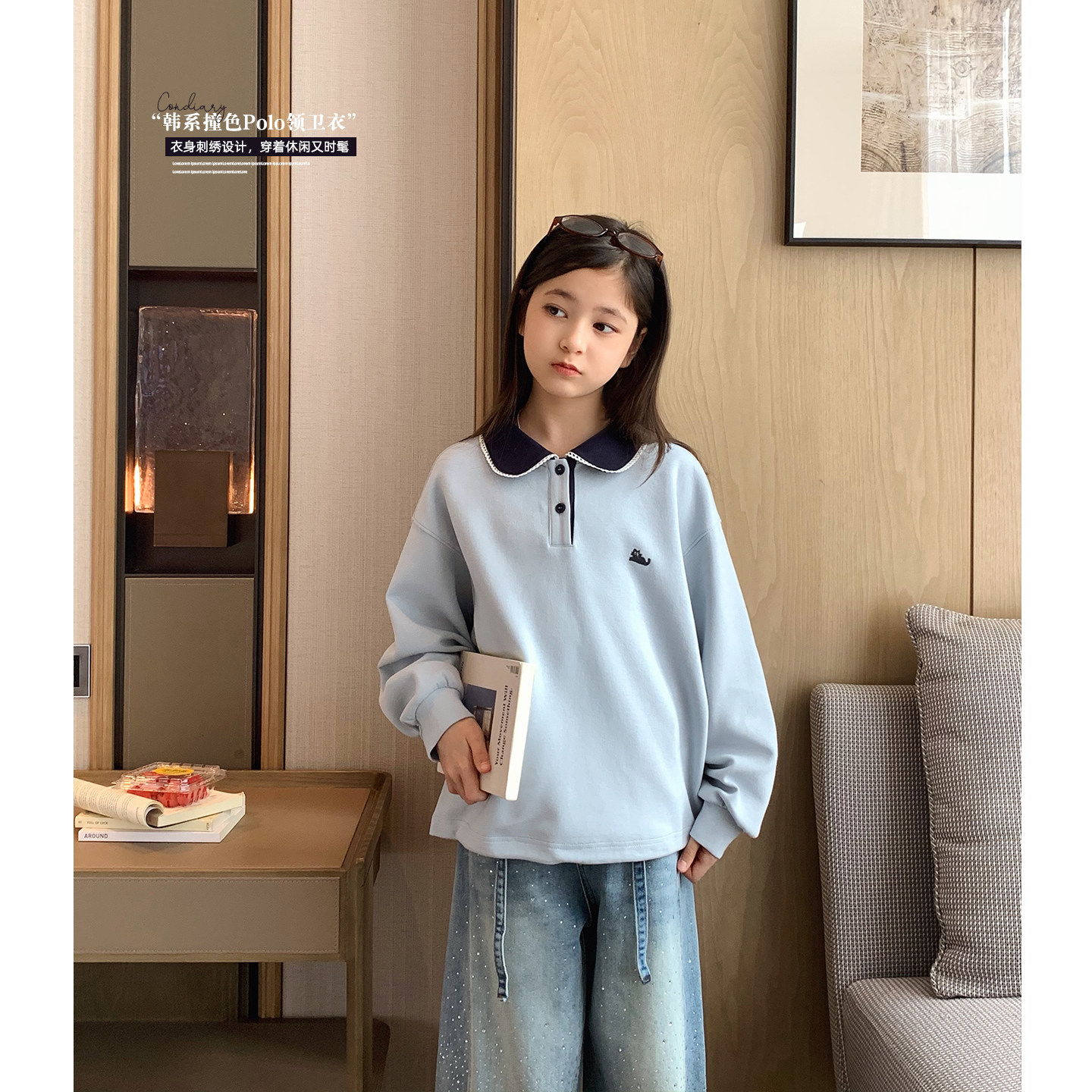 女大童浅蓝翻领学院风卫衣2026春装新款初中生POLO领少女韩版上衣