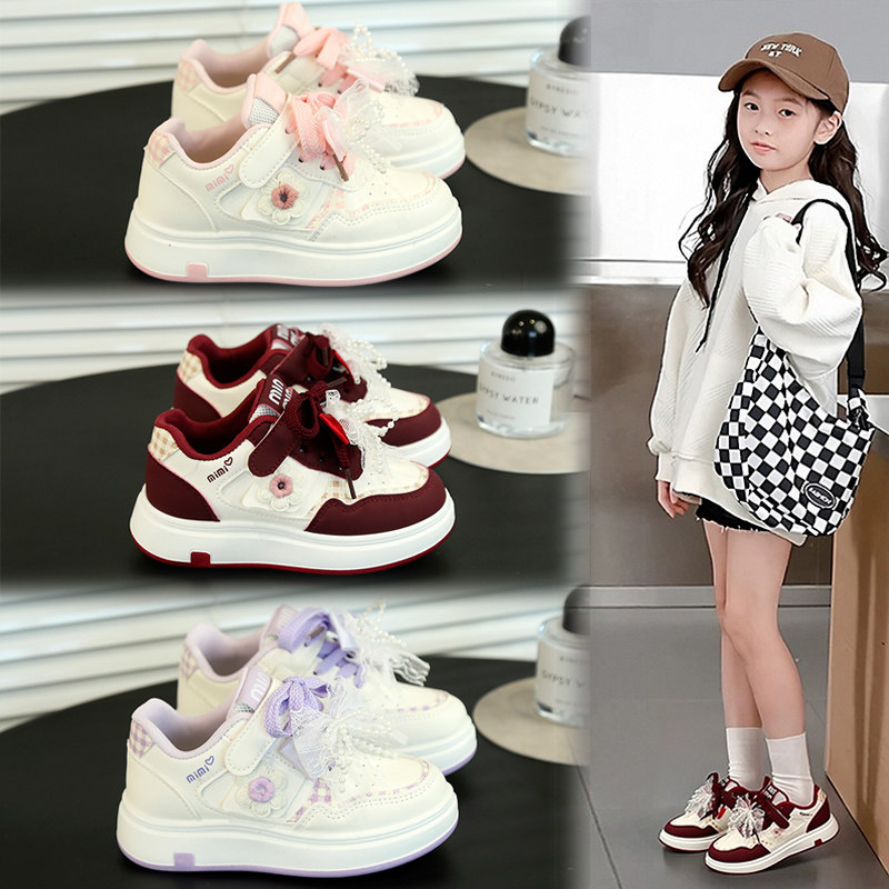 女童鞋2026春款儿童韩版甜美珍珠蝴蝶结网面公主单鞋休闲运动鞋女