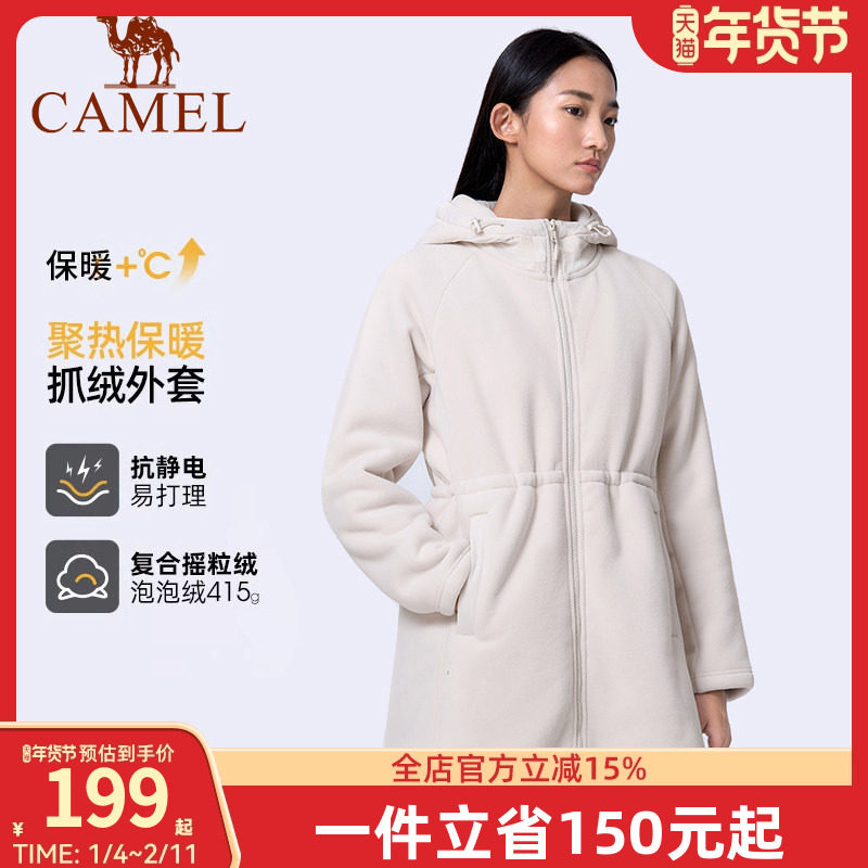骆驼户外新款春秋摇粒绒发热保暖防风外套开襟中长款连帽抓绒衣女
