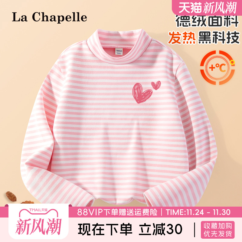 拉夏贝尔打底衫女童秋冬款条纹上衣大童德绒长袖t恤儿童粉色春装