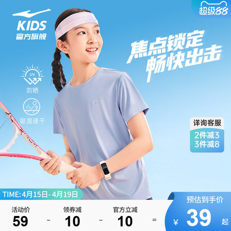 鸿星尔克童装女童短袖T恤儿童运动防晒速干夏季大童透气上衣夏装