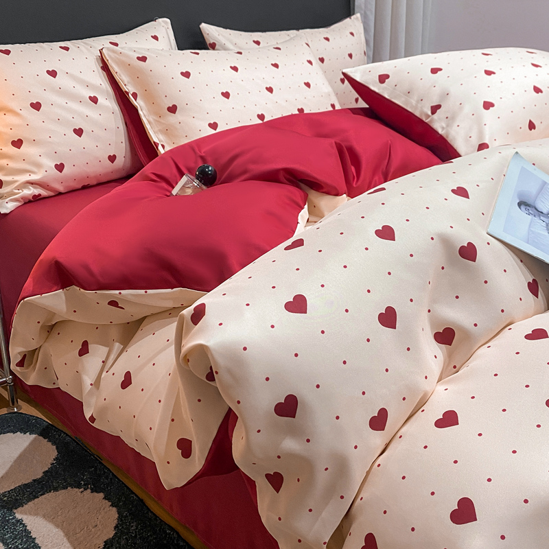 ins红色小爱心冰丝四件套夏季水洗真丝被套床单笠宿舍床上三件套4