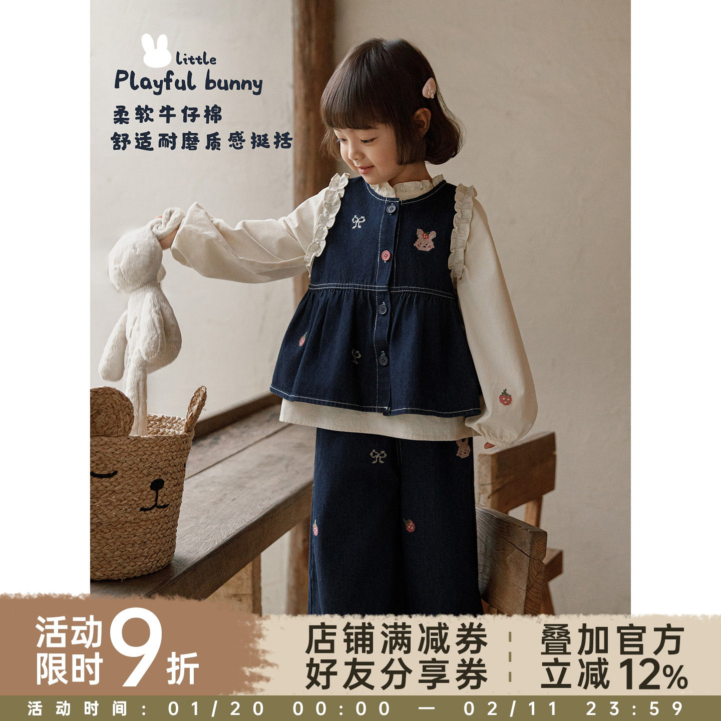 幼悠女童春季新款纯棉木耳领娃娃衫宽松牛仔直筒裤无袖马甲套装潮