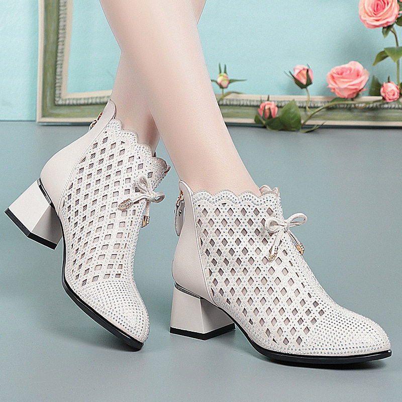 新款粗跟短靴女真皮中跟网纱靴镂空女靴夏季单靴透气凉靴春秋女鞋