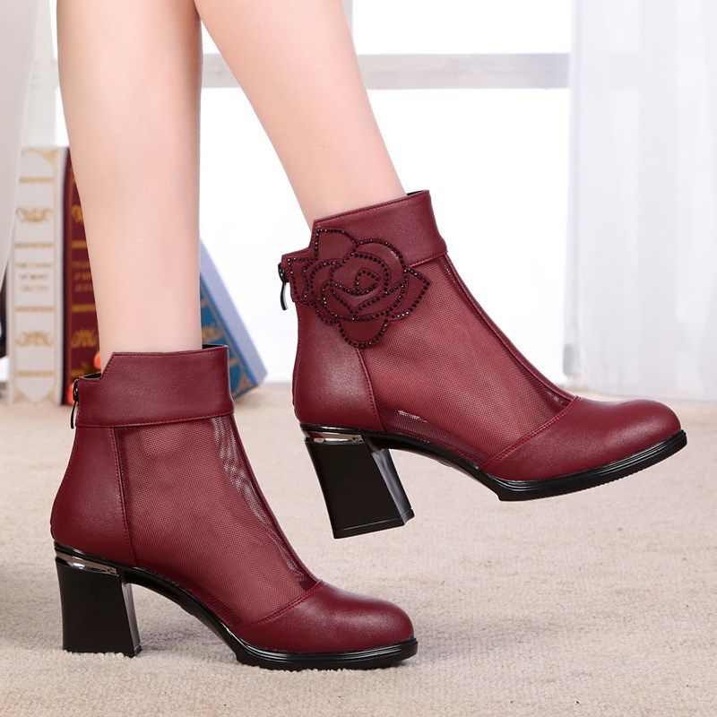 2022春秋新款真皮女网靴粗跟凉靴高跟鞋镂空网纱女靴粗跟妈妈短靴