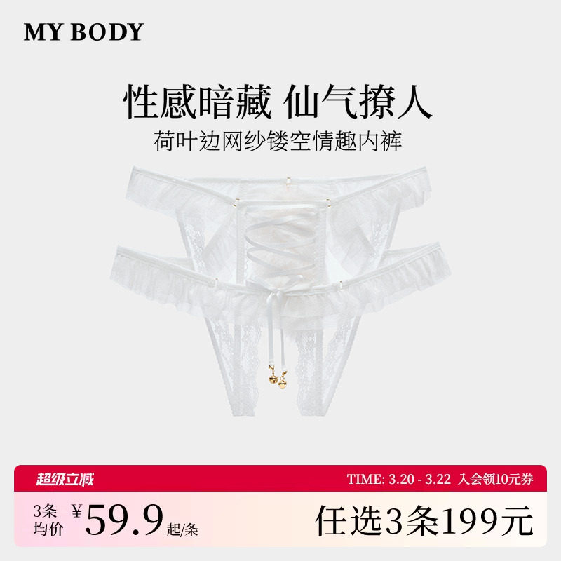 3件199|商场同款MYBODY丁字裤女性感蕾丝荷叶边网纱镂空情趣内裤