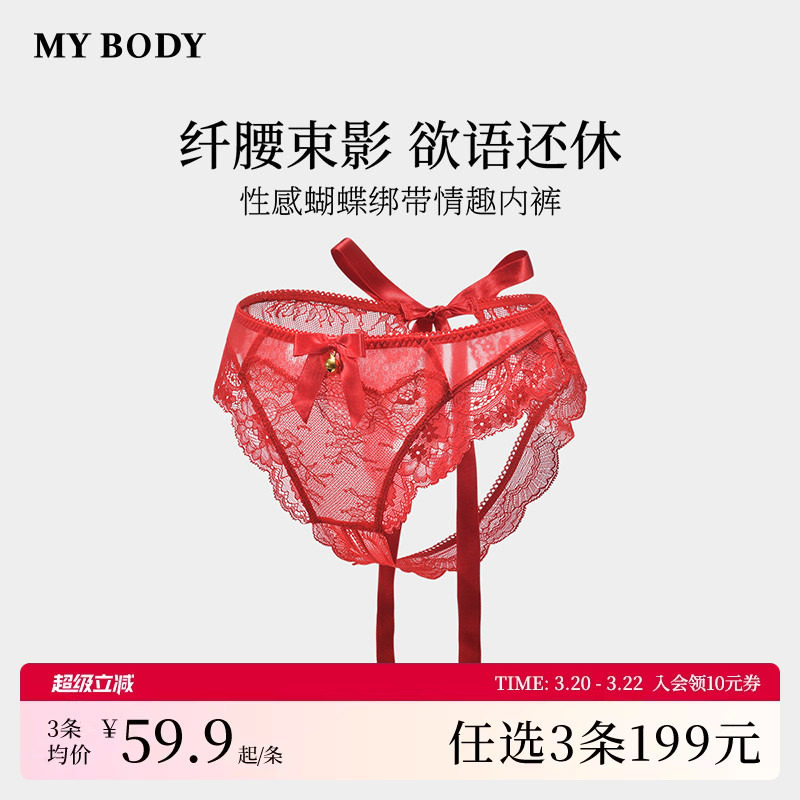3件199|商场同款MYBODY新款蝴蝶结绑带蕾丝性感情趣开档丁字裤女