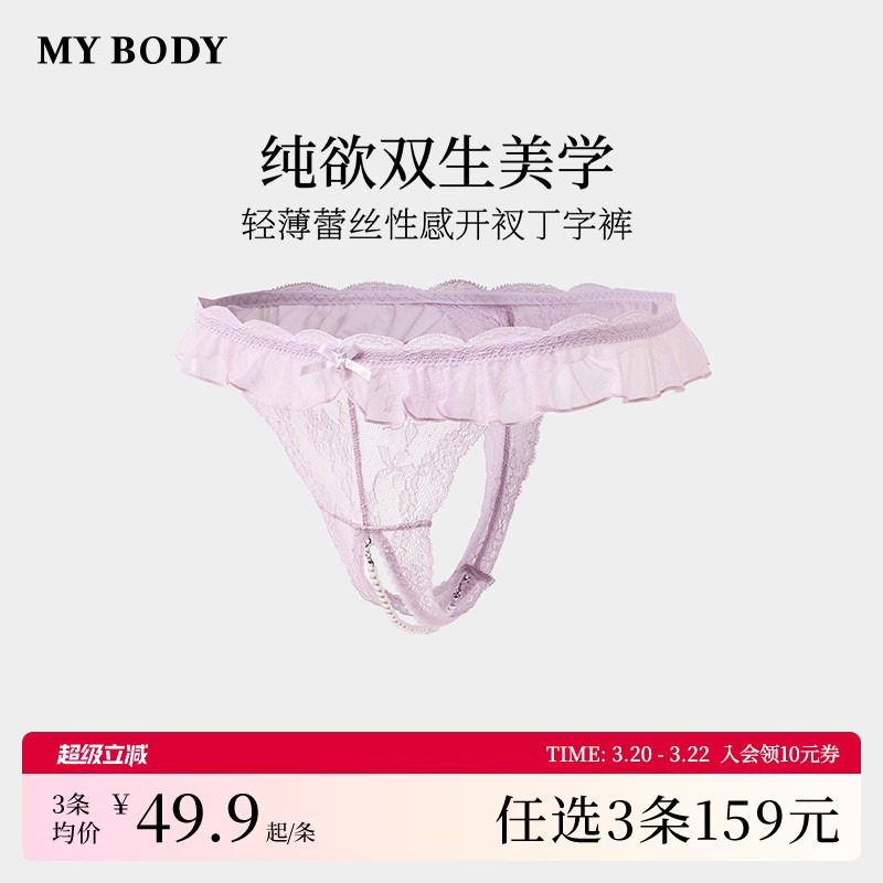 3件159|MYBODY商场同款内裤女性感蕾丝禁欲系情趣开档丁字裤内裤