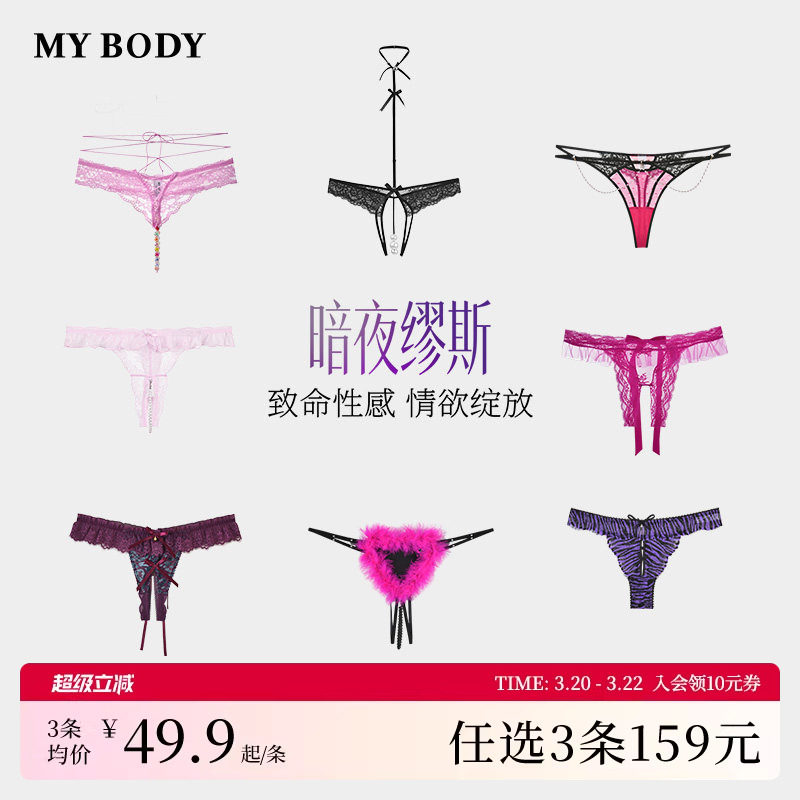 3件159|MYBODY商场同款性感火辣镂空女裤蕾丝露裆情趣珍珠丁字裤