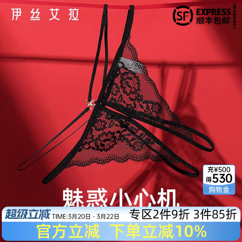 伊丝艾拉黑色情趣丁字裤女性感火辣开档内裤法式镂空蕾丝低腰t裤