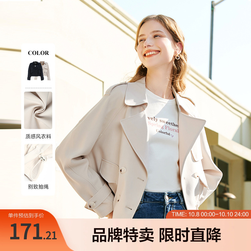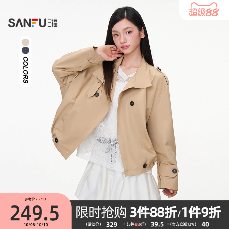 三福短款风衣女2025新款秋季小个子系扣双排扣宽松外套女装507331