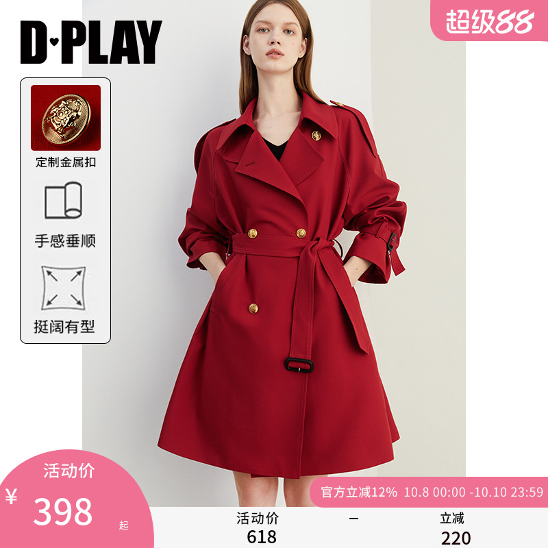 DPLAY2025秋季新款气质红色风衣女翻领宽松流行气质短款外套上衣