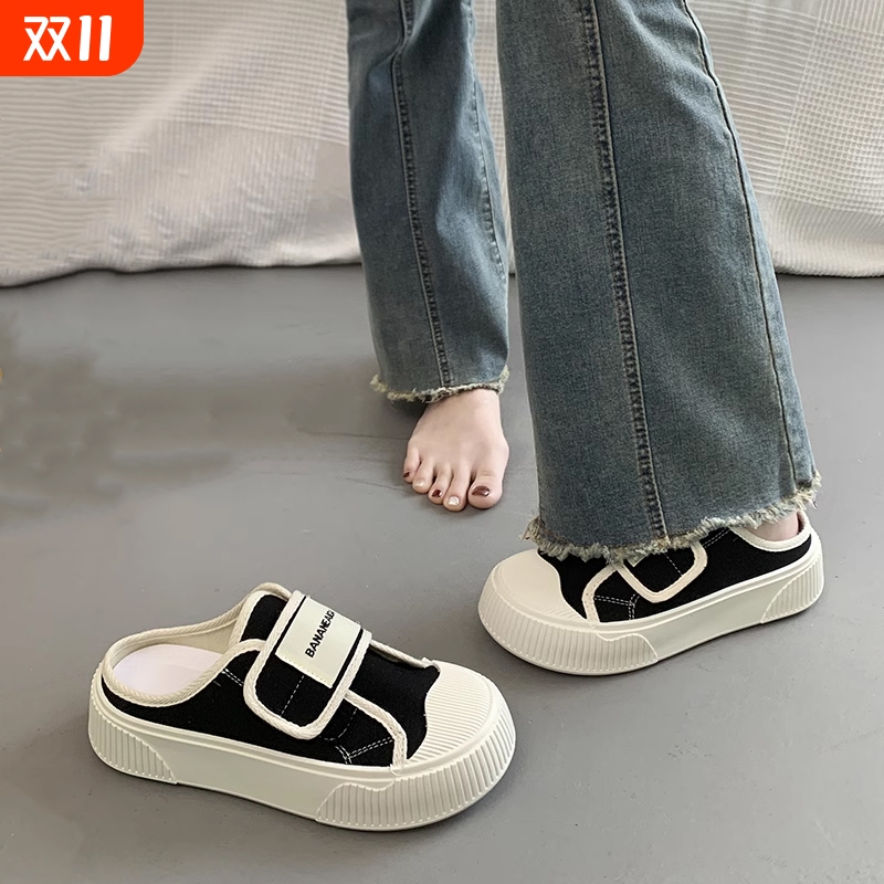 帆布半拖鞋女2025年春秋新款厚底魔术贴小白鞋两穿一脚蹬休闲板鞋