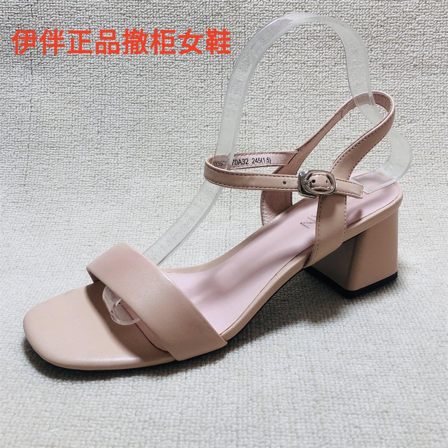 伊伴撤柜断码羊皮女鞋温柔风一字带凉鞋女中跟粗跟搭扣百搭夏季潮