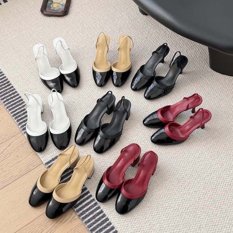 2026春夏新款小香风真皮拼色包头凉鞋女中跟尖头浅口百搭舒适单鞋