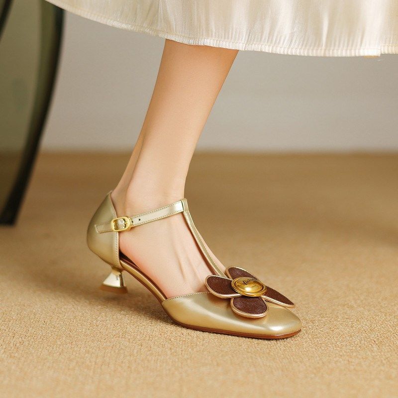 2024夏季新款真皮粗跟包头复古凉鞋女中跟T型带花朵镂空金色单鞋