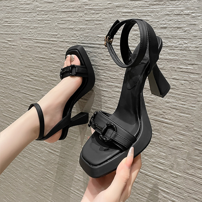 网红一字带黑色职业凉鞋女中跟2023年新款防水台粗跟高跟鞋女夏