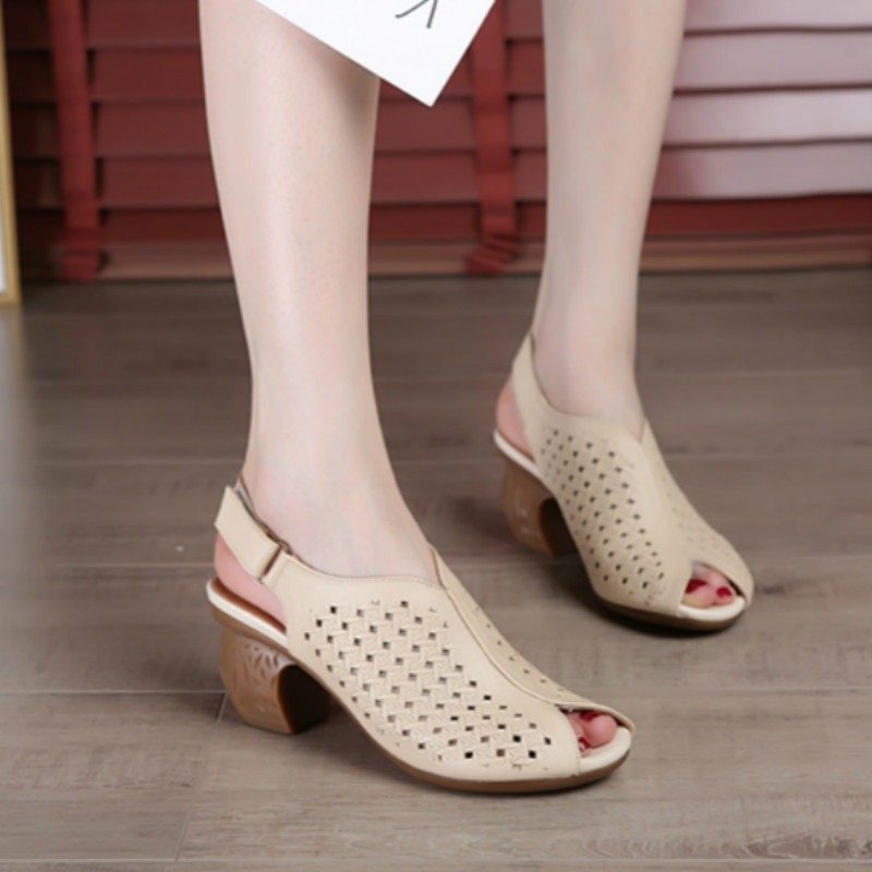 2025新款百搭鱼嘴凉鞋女中跟粗跟真皮夏季女鞋妈妈凉鞋高跟时装鞋