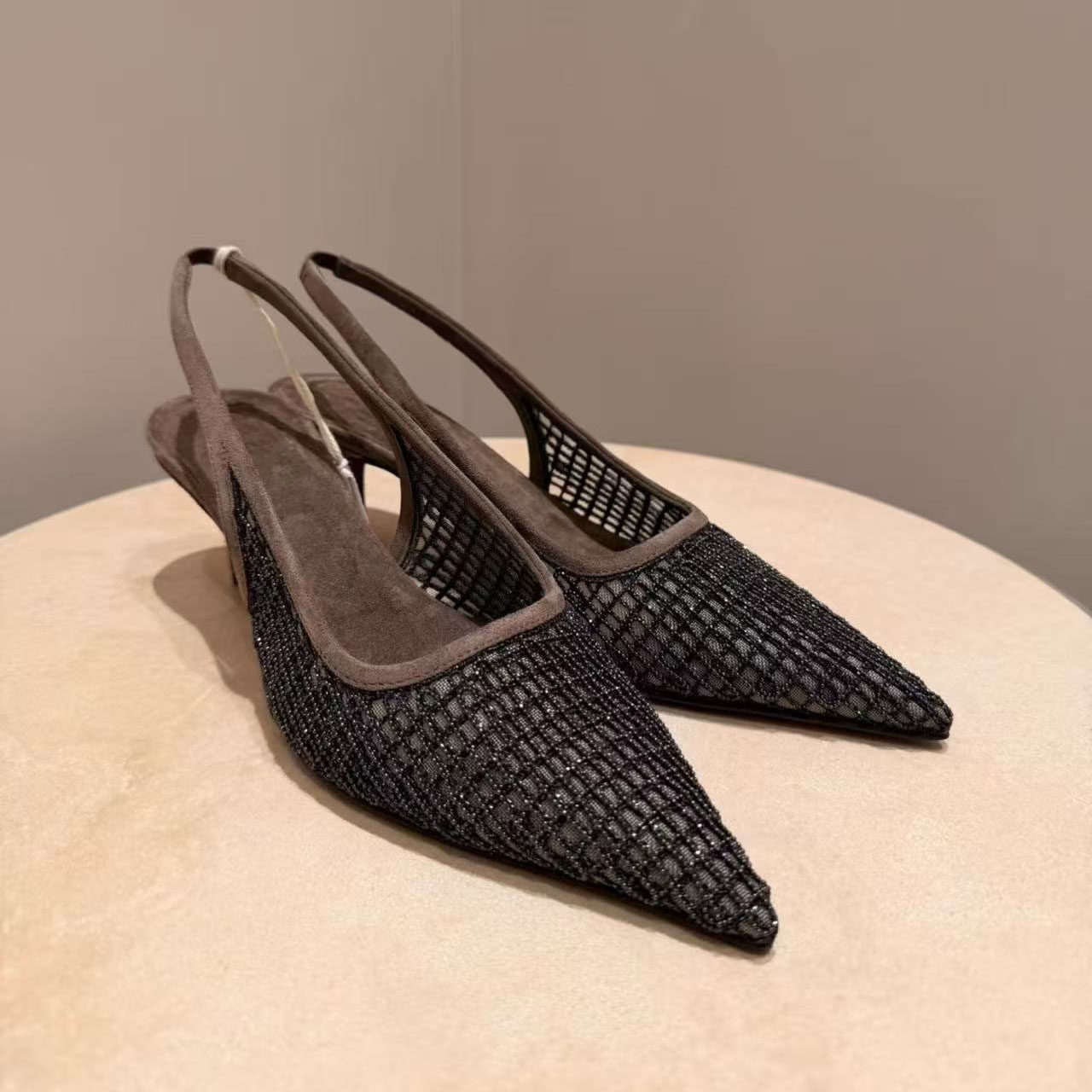 2025年开春新款名媛风尖头后空凉鞋女中跟网纱镂空水钻气质高跟鞋