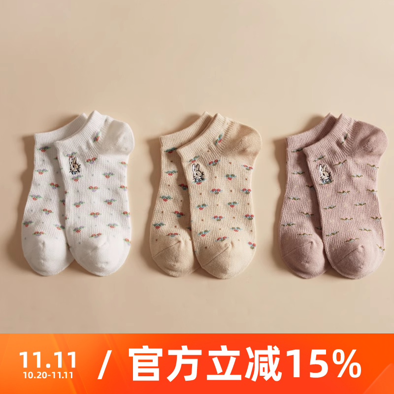 日系小清新碎花全棉短袜子女士韩版ins运动潮流兔子休闲吸汗船袜