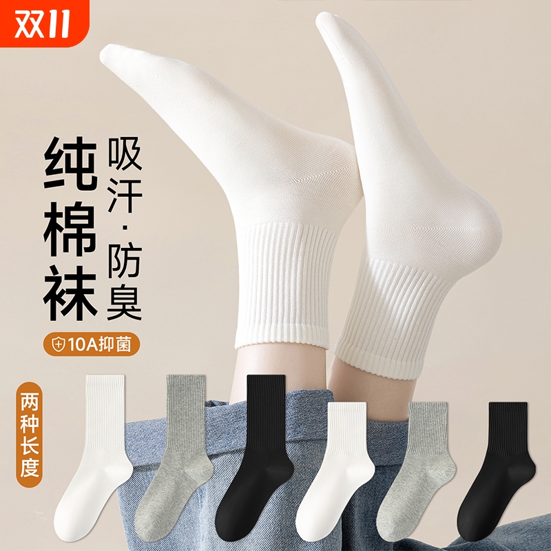 袜子女款秋冬纯棉中筒袜全棉短袜抗菌棉袜防臭运动白色女士无骨袜