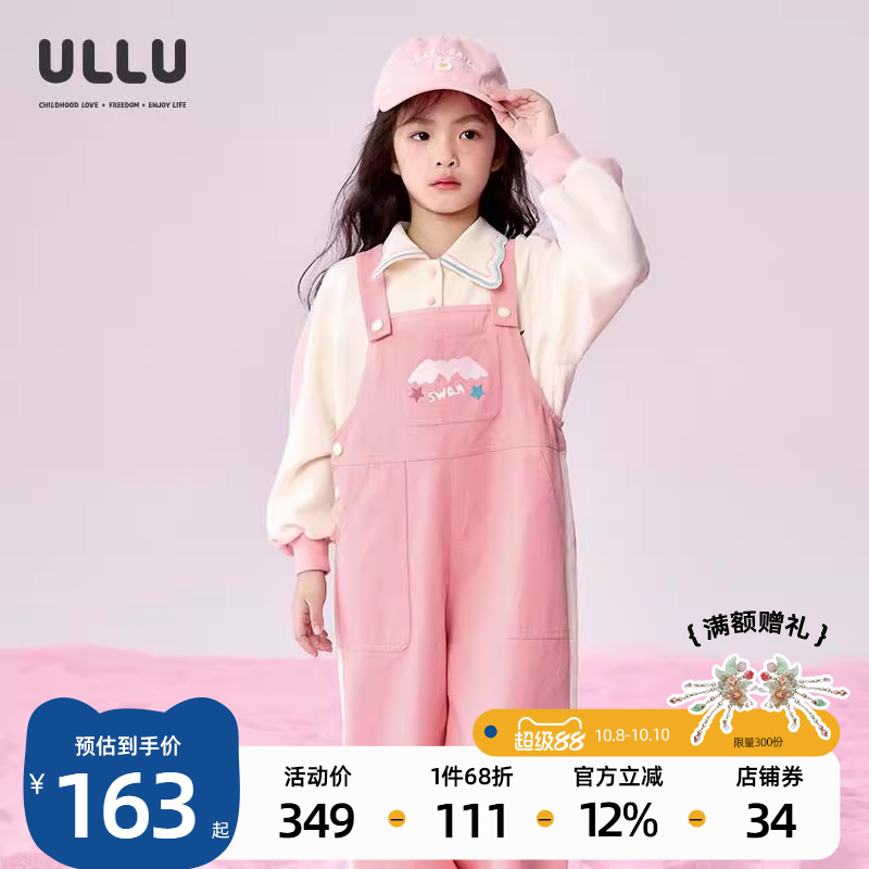 ULLU优露童装女童连衣长裤25春款甜美做旧拼色直筒粉色牛仔背带裤