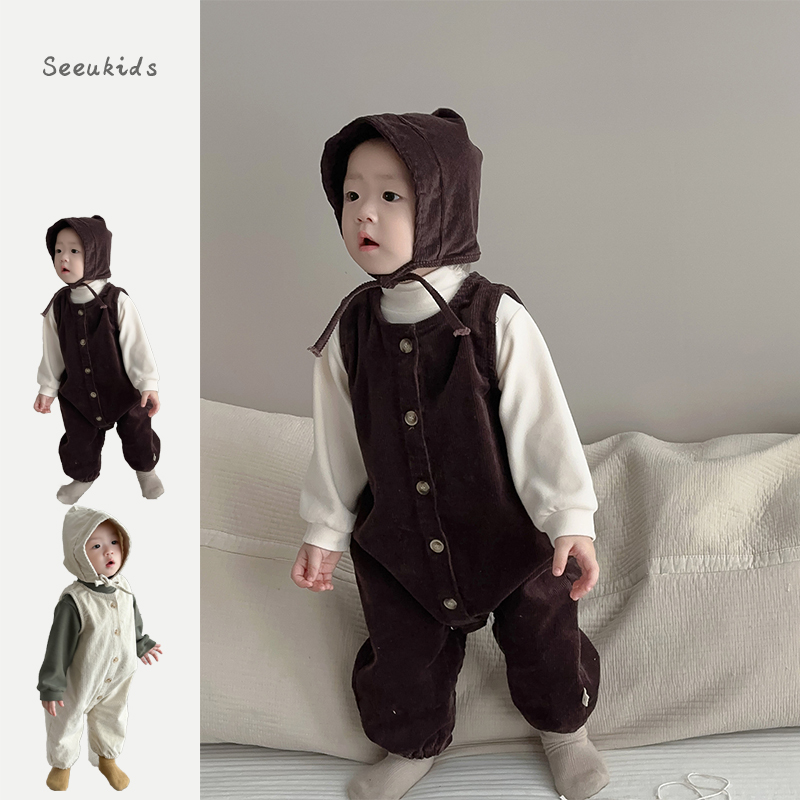 2025春季新款韩版婴儿灯芯绒背带裤纯色打底衫两件套男宝春款套装