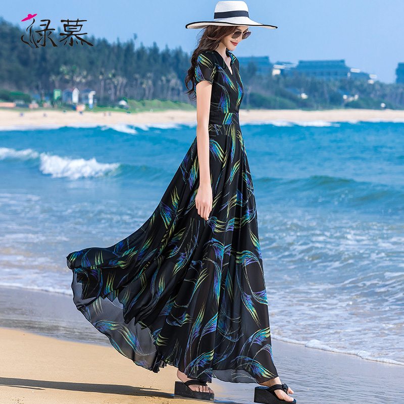 绿慕2025气质修身显瘦长款波西米亚连衣裙夏季女装大摆雪纺长裙仙