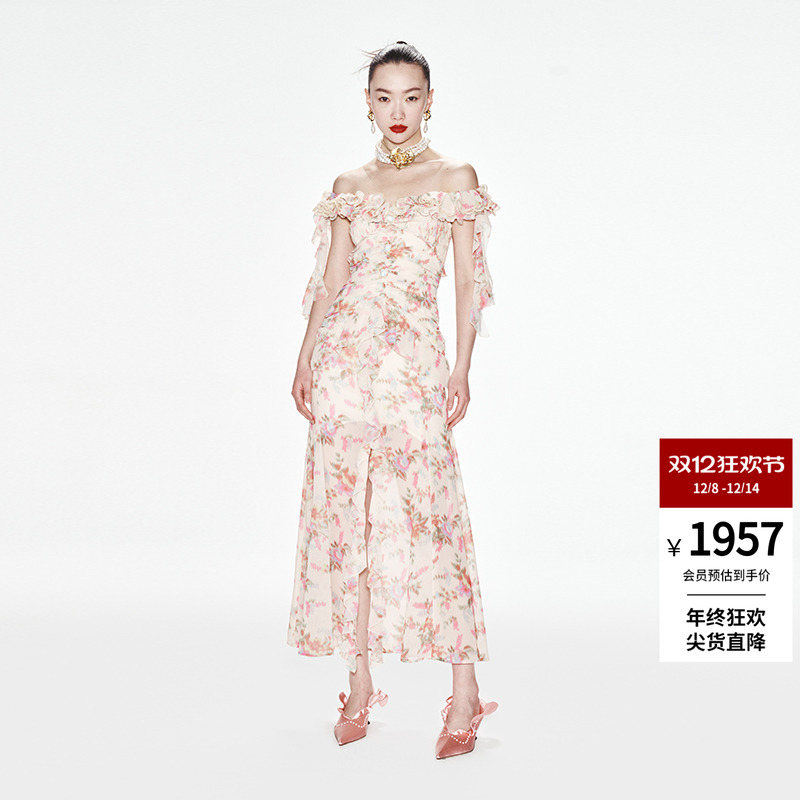 法式小众夏季雪纺碎花连衣裙女新款荷叶边气质修身中长款大摆裙潮